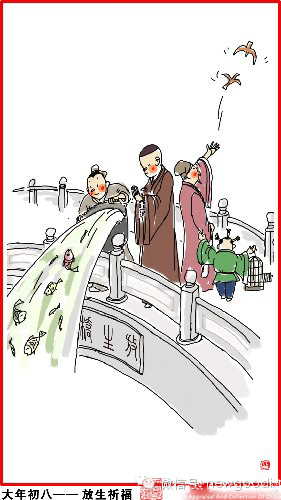 大年初八,放生祈福。众星下界之日,制小灯燃而祭之,一寸光阴一寸金。