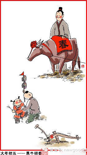 大年初五,艮牛耕春。五路接财神,东西南北中,财富五路通。