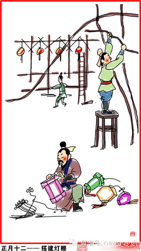 正月十二,搭建灯棚。元宵节将近,开始做元宵赏灯的准备工作。