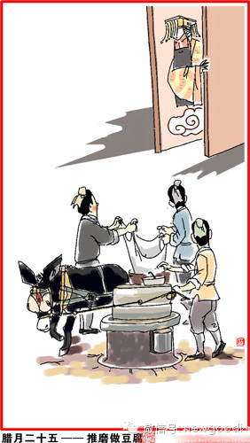 腊月二十五,推磨做豆腐。传说玉帝会下界查访,吃豆腐渣以表清苦。