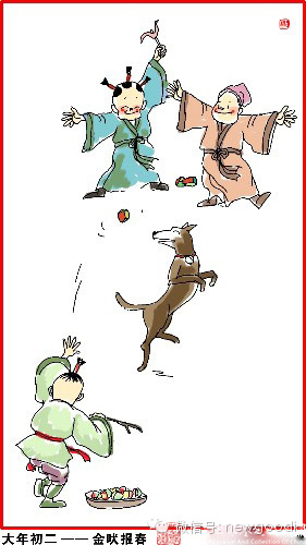 大年初三,金吠报春。亲眷人家去拜年,东家留吃饭、西家排酒筵。