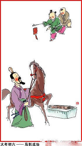 大年初六,马到成功。沥酒拜街中。万户千门看,无人不送穷。
