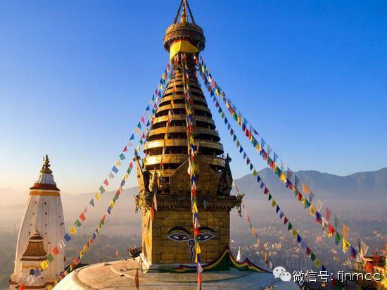 斯瓦扬布寺(意为“自体放光”)是亚洲最古老的佛教圣迹之一,位于尼泊尔首都加德满都西面,又因庙中栖息着数百只野生猴子,俗称“猴庙”。该寺主体建筑是一座“柴特亚”式大佛塔,纯白色的塔基,金黄色的塔身,塔顶是层层递减的十三层镀金环轮,象征菩萨从因至果的十三行位,最高层的伞盖便代表了涅槃胜果。
