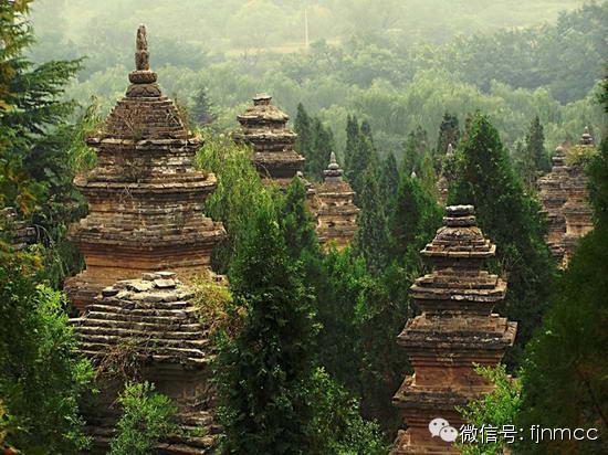 少林寺,坐落在丛林茂密的少室山阴,是少林武术的发源地。其内有唐代到清代的砖石墓塔数百座,看似茂林,称为塔林。