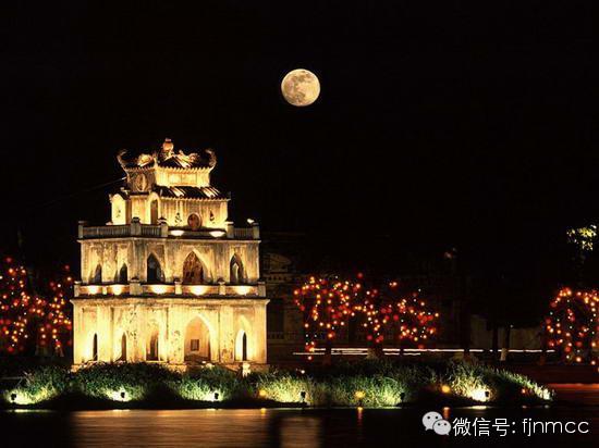 建于1884年的河内龟塔,位于还剑湖中的龟丘岛上,是一座多层尖顶四角飞檐的小塔。图中龟塔在灯光下更加玲珑剔透。