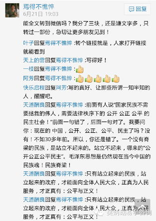 杨澜女士,民族利益,不能据个人得失。有一次我问一个以前地主的儿子:你热不热爱毛泽东?他说:热爱呀。我继而问:毛泽东分了你家的田地,怎么还爱呢?你猜他怎么说?他说:当地主阶级占有大量土地这种主要的生产资料的时候,就严重阻碍了生产力的发展,就必须重新分配。我万万没有想到他能用政治经济学理论来说明问题。接着他举了一连串事例来说明毛泽东的伟大。请你记住,他是一个小山沟里的普通农民,就在鄱阳湖北岸。