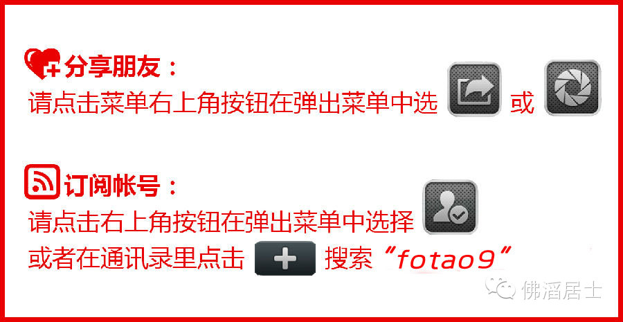 新朋友可查找公众账号:佛滔居士,或者搜索微信号:fotao9,关注佛滔居士官方微信,收听和转发每日精彩内容,积福德,开智慧。