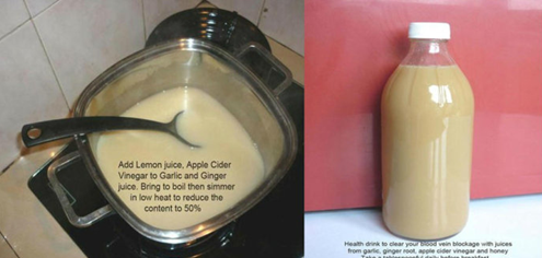 2. 将蒜头、姜汁放入瓦煲,加入柠檬汁与苹果醋,大火滚,小火慢煮,不要盖锅盖,让水份蒸发,大约需要半小时,剩下大约一半汁液。